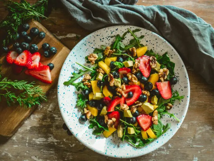 This Arugula Salad recipe sweet, refreshing, filled with fresh fruit, creamy avocado, and topped with crunchy walnuts and a drizzle of spicy vinaigrette. It is a perfectly healthy salad for the warm summer months.
