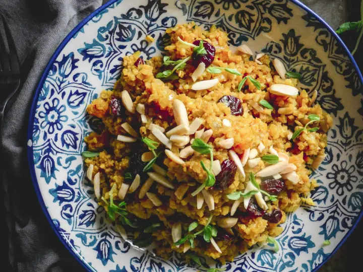 This grain-free Moroccan couscous is made with cauliflower rice, cherries, apricots, and crunchy almonds and is a delicious alternative to traditional couscous.