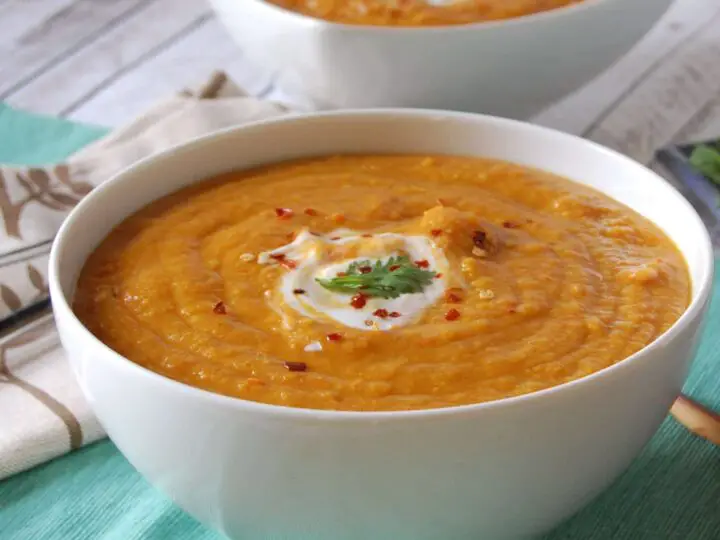 Moroccan Carrot Red Lentil Soup is a meatless soup recipe packed full of flavor! Cumin, turmeric, coriander, paprika, and cinnamon complement the red lentils and carrots, creating a creamy, filling soup.