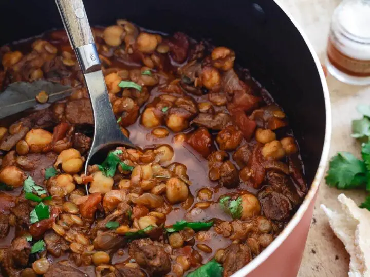 This lamb lentil stew is flavored with Moroccan spices and beefed up with chickpeas. Serve with fresh cilantro and a dollop of yogurt for a hearty and comforting winter meal.