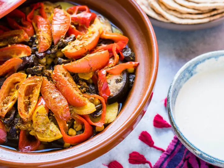 Eating a Moroccan Vegetable Tagine is such a wonderful way to finish up a rainy or cold day. The steamed vegetables that have been slowly cooked in a spiced broth served with a simple but mouth-watering tahini sauce will warm up your body in the most delicious way.