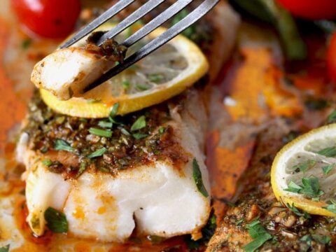 Wild Cod, green beans, and tomatoes are roasted to perfection with super flavorful herb, lemon, and garlic Chermoula Sauce. This Moroccan-inspired flavor-packed baked cod recipe is cooked in less than 22 minutes!