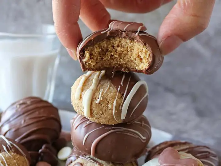 These Almond Flour Peanut Butter Cookies are my tasty, gluten-free, eggless, spin on traditional peanut butter cookies. These melt-in-your-mouth cookies are made with 6 main ingredients and are ready to enjoy in 30 minutes. Serve them dipped in chocolate for a truly indulgent cookie.