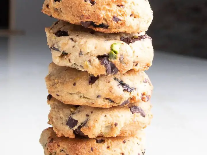 Easy recipe for Grain-Free Cookies. Dairy-Free and delicious. Chocolate, pistachios, and dried cherries make these gluten-free cookies fun too!