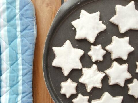 Zimtsterne are cinnamon almond cookies cut out into different-sized star shapes.