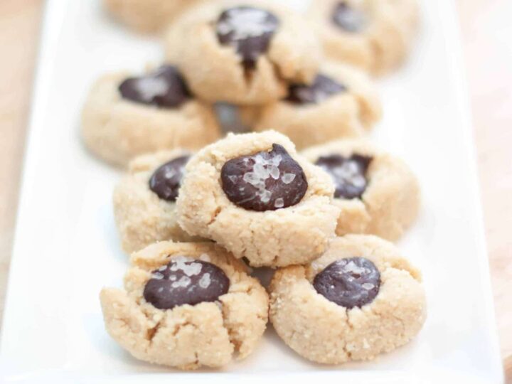 Vegan Salted Cacao Thumbprint Cookies are the perfect gluten free, vegan holiday cookie that will be crowd pleasing to all of your guests!