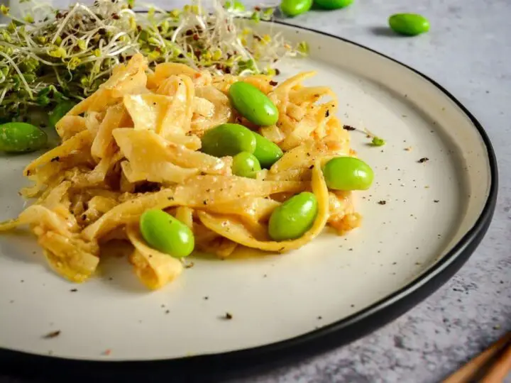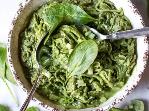 These quick Paleo “Peanut” Noodles are made from rutabaga and are surprisingly similar to actual noodles. They work beautifully with the cashew and tahini sauce to create a creamy vegan and paleo recipe.