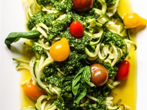 This recipe for raw zucchini noodles with pesto and tomatoes is one of the simplest ways to turn your food into medicine. The whole recipe takes only a few minutes and it’s so healing and fresh tasting — it’s a keeper!