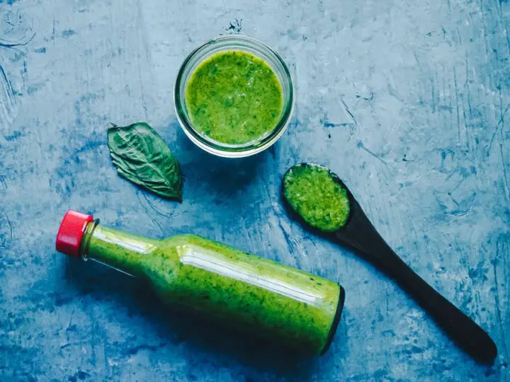 Basil Vinaigrette made with basil, onion, garlic, mustard, vegan mayo, vinegar, olive oil, and spices for a quick, easy, healthy, creamy, and delicious salad dressing recipe perfect for salads, soups, bread, pasta — you name it! Low-carb and keto diet friendly!