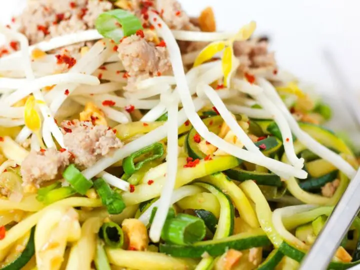 Keto Chicken Pad Thai has all the flavors of the traditional rice noodle dish but with just a fraction of the carbs! An authentic and flavorful keto chicken pad thai! Sweet, sour, salty, and spicy, this pad thai will hit all of your taste buds. A super easy meal for 4 and ready in just 30 minutes!