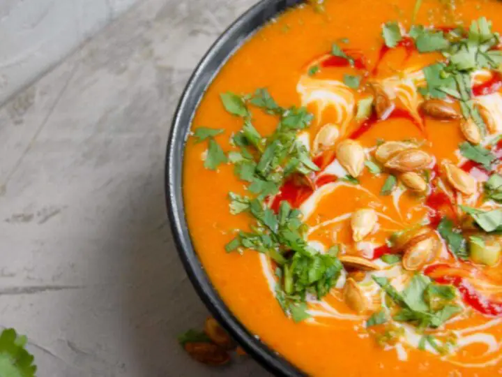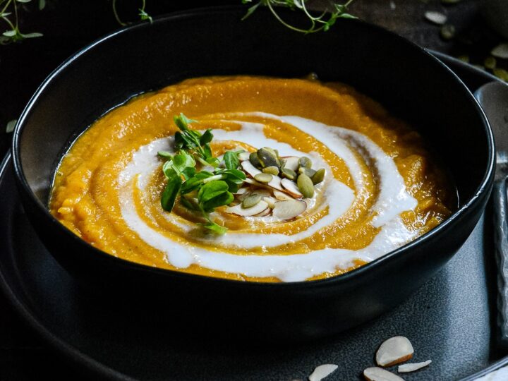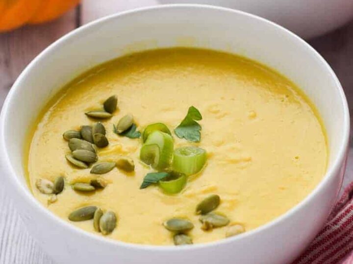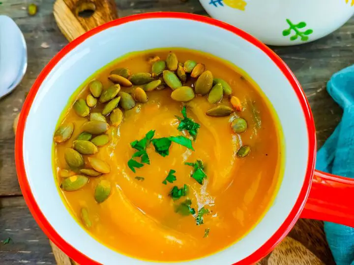 A healthy pumpkin soup made by roasting whole fresh pumpkin and has no cream, milk, or stock yet is smooth and creamy. This simple pumpkin soup without cream requires no chopping or boiling. Just roast, blend, and enjoy!