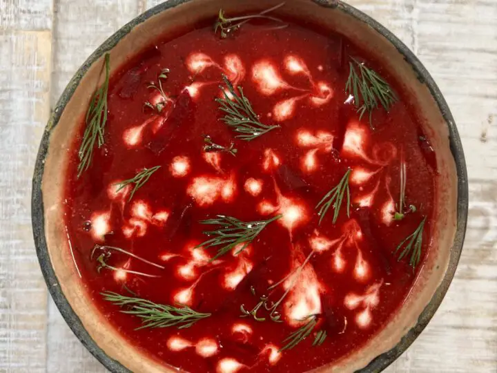 This recipe draws inspiration from borscht, the traditional red beet soup from Ukraine. While it has little to do with traditional borsch, I am taking inspiration from its flavour profile.