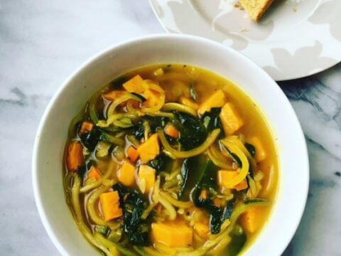 This bone broth vegetable soup is food for the mind, body, and soul. It is nourishing, gut healthy, full of antioxidants, and takes just minutes to prep. It can easily be made vegan by substituting bone broth for vegetable broth.