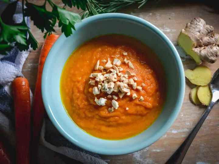 This delicious creamy carrot ginger soup is warming, nutritious and delicious. It can be served either hot or cold.