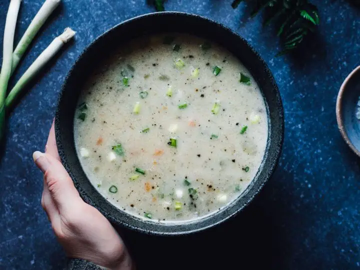 This creamy Vegan Potato Soup can be made in the Instant Pot or on the stovetop for ease and convenience! Naturally vegan and gluten-free, with a vegetarian option. This delicious recipe can also be found in my cookbook The Vegetarian Family Cookbook.