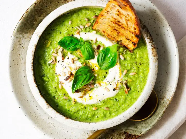 This super green plant-based broccoli soup with peas and basil is the perfect bowl of comfort food, no matter the weather. The gorgeous Spring green colour and fresh flavours are both beautiful and delicious. And you can use fresh or frozen broccoli.
